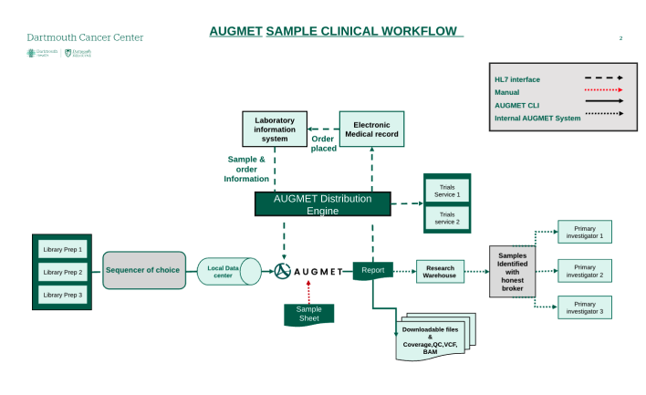 AUGMET Academic, backed by Dartmouth Hitchcock’s Genome Informatics Department, supports U.S. academic institutions with standardized genomic reporting and de-identified data sharing, fostering collaboration with industry-standard SLAs.